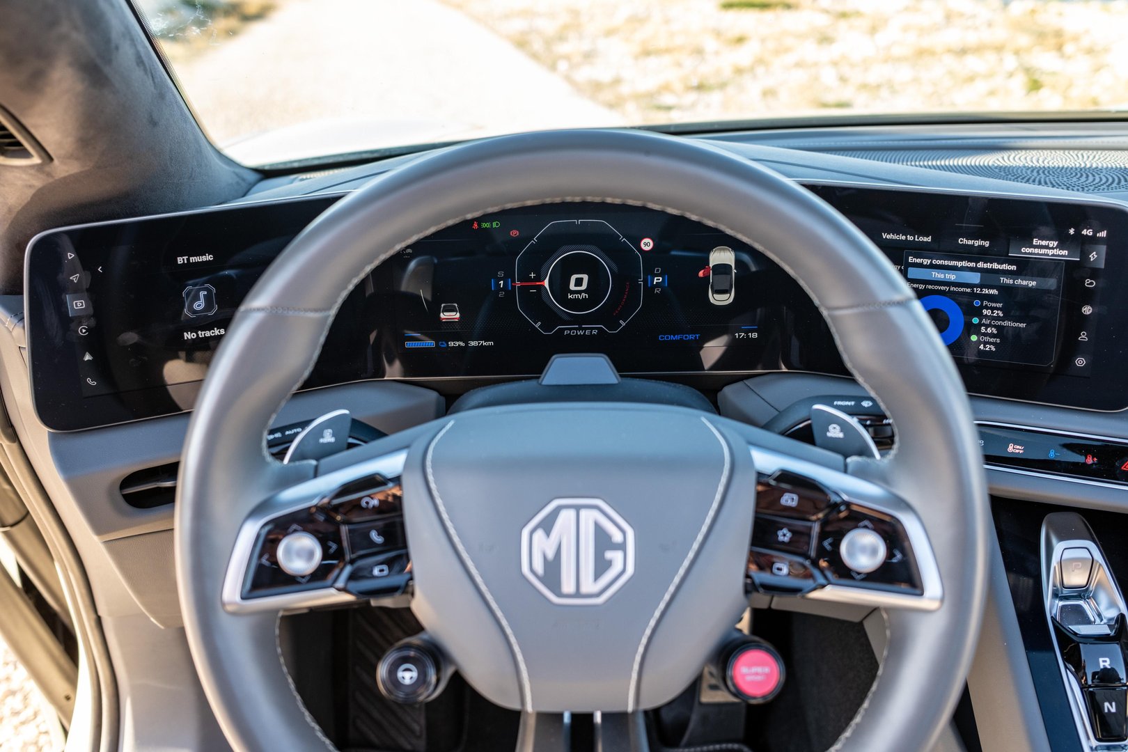 Kako je voziti roadster z električnim pogonom in skoraj dvema tonama mase? Najprej predvsem hitro (vsaj v ravni črti, ampak o tem dva odstavka kasneje). Različica GT se namreč z dvema motorjema s skupno močjo 375 kilovatov (504 konjske moči) do stotice izstreli v 3,2 sekunde. Seveda takoj opazim rdeč gumbek na volanu, na katerem piše “super sport”. Lahko bi denimo pisalo tudi “nelagodje”. Ko Cyberster uporabi vso moč, mi pospeški namreč reorganizirajo notranje organe. Tovrstni brutalni pospeški so v električnih avtomobilih sicer suhoparni in mi niso posebej vznemirljivi.