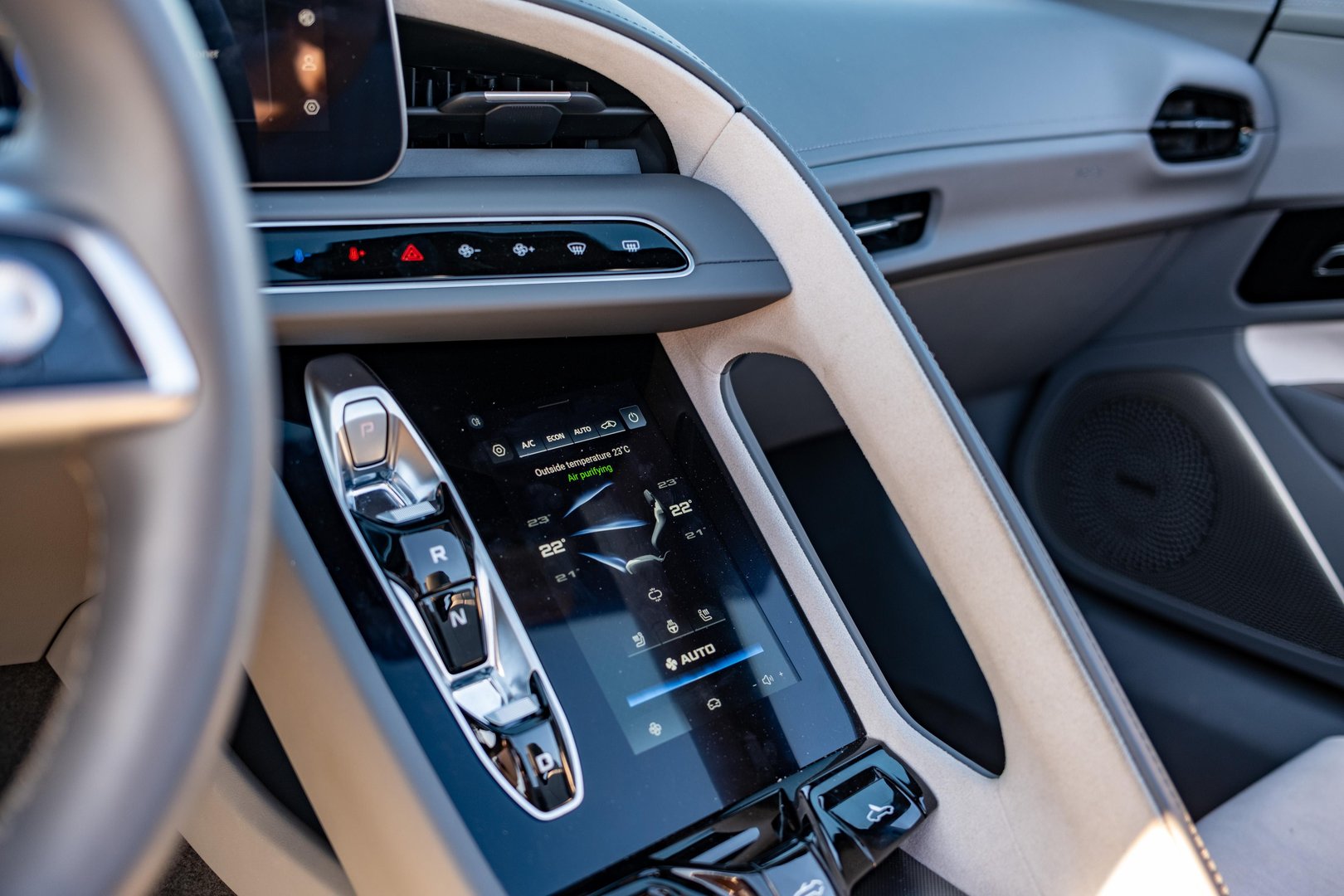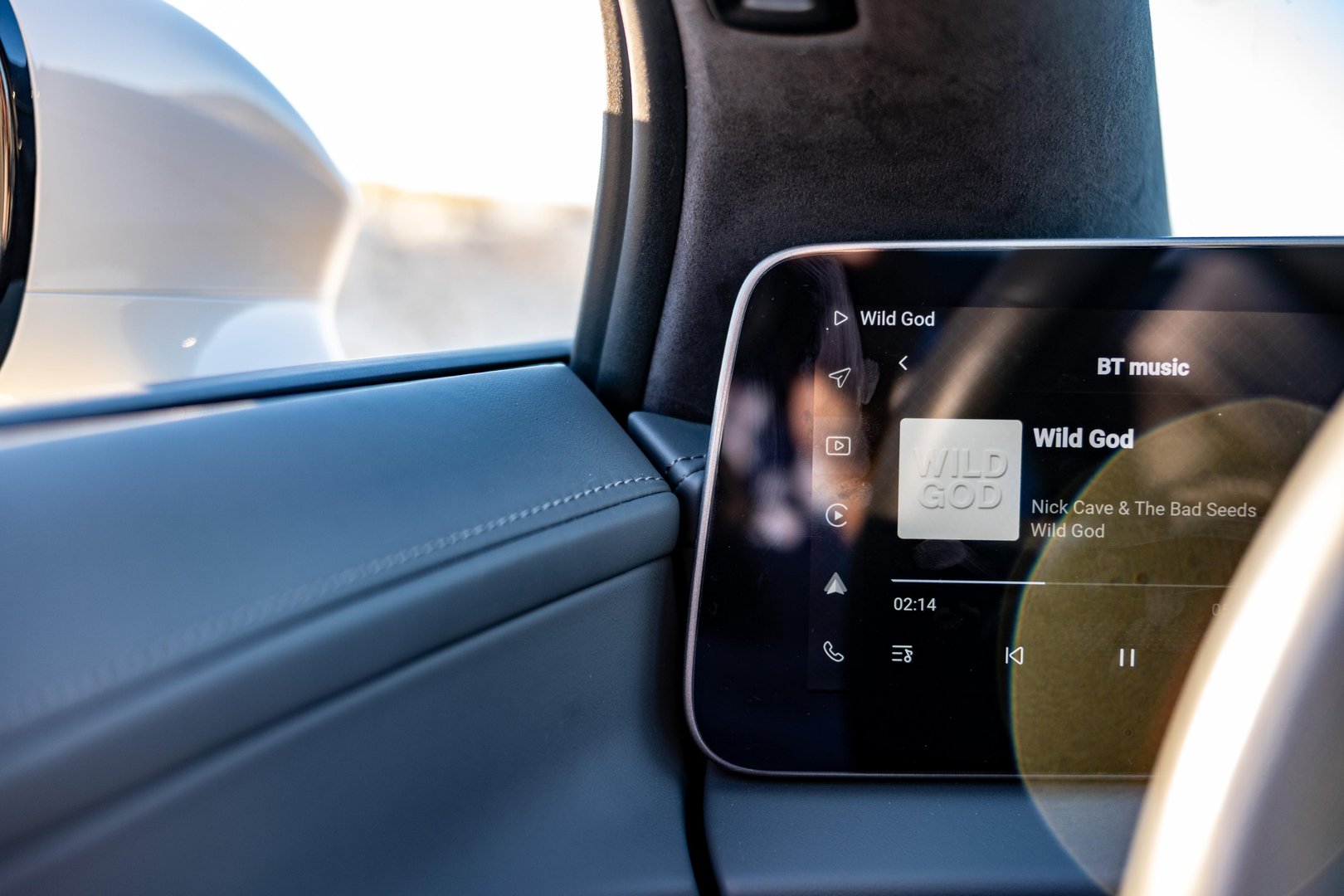Zanimive poteze se nadaljujejo v notranjosti. Ta je po občutku sicer razkošna in prijetna. Okoli mene je kompozicija zaslonov. Štirih zaslonov, če sem natančen. Ideja se mi iz uporabniškega vidika ne zdi nujno slaba. Vsak zaslon ima svoje vsebine - levi navigacijo in multimedijo, desni spodnji klimatske, vozne in druge nastavitve denimo. In v teoriji lahko vmesnik na posameznem zaslonu ostane tam, kjer sem ga pustil in imam vse vedno na pregledu. A izvedba ni dovolj dovršena, zasnova pa pomeni tudi, da je sovoznik povsem odrezan od uporabe multimedije in navigacije. Za uporabo Apple Carplay ali Android Auto je telefon potrebno povezati s kablom.