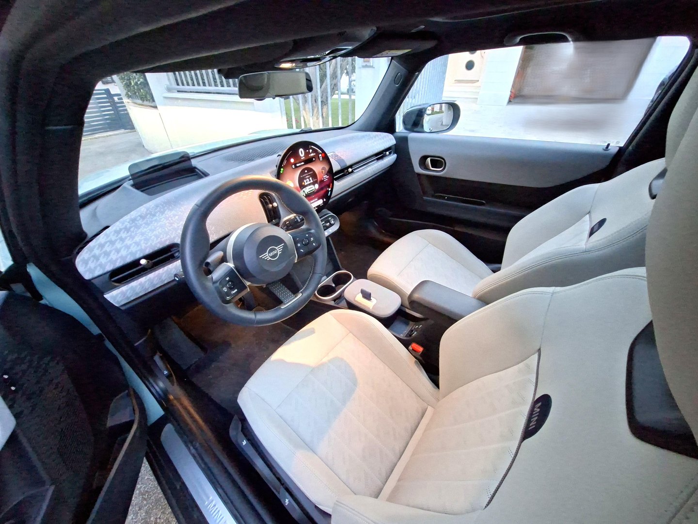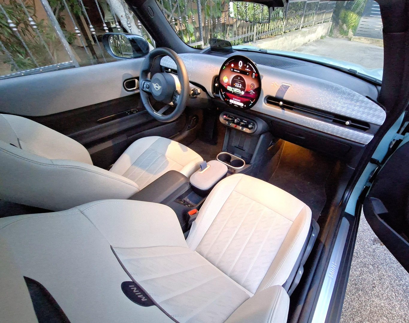 Tudi vozne programe ponuja, ki pri Miniji niso ravno programi, so pa vozne, hmmm, recimo Izkušnje. Neke velike razlike med sedmimi ponujenimi res ni. Le športni način, ki je pri miniju Gokart mode in vklop pospremi z zabavnim vzklikanjem, pomeni bolj strm prirastek moči in navora in bolj oster odziv menjalnika (ki si sicer vzame kak trenutek za razmislek...). In še varčevalni način, ki optimizira porabo (in dodatne porabnike). Vsi ostali se bolj osredotočajo na vizualni in izkustveni vtis potnikov – zvok, osvetlitev kabine, nastavitev hi-fi sistema, … Hja, zelo malo praktičnega učinka - ampak spretna marketinška poteza. So pa pod zaslonom ohranili značilna preklopna stikala – in tam je zdaj tudi stikalo menjalnika, tako da je med sedežema nekaj dodatnega prostora. Tako je armaturna plošča poslej še malo bolj minimalistična, s površino oblečeno v na otip prijazno tekstilno prevleko, kar doda k vtisu kvalitete. In z elegantnimi zračniki, integriranimi v armaturo.
