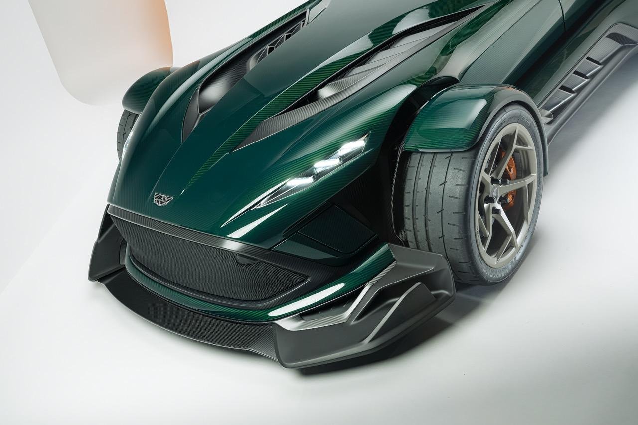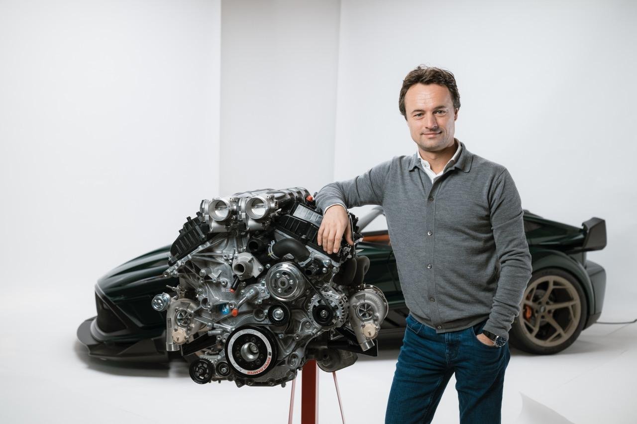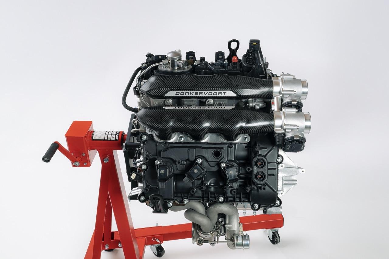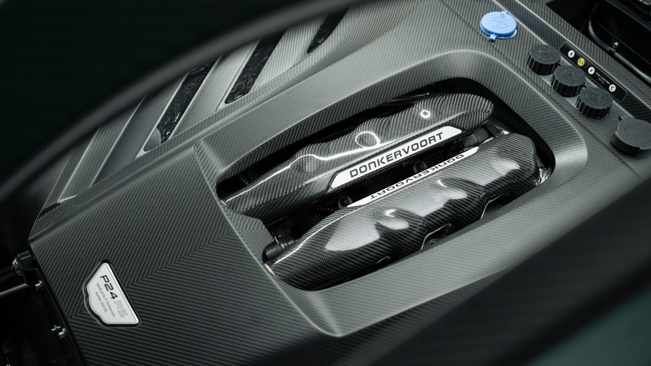 Tehnična zasnova motorja vključuje suho mazanje, spremenljivo krmiljenje ventilov ter kombinacijo neposrednega in posrednega vbrizga goriva. Sesalni sistem je izdelan iz ogljikovih vlaken, izpušni kolektorji pa so 3D-natisnjeni, kar jasno kaže na obsesijo znamke z maso in togostjo. Za nadtlak skrbita turbopolnilnika nizozemskega podjetja Van der Lee.