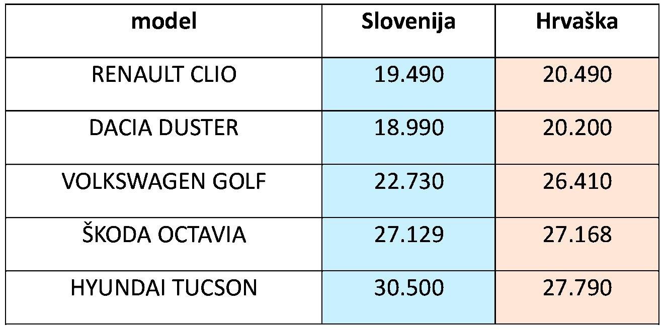 Za primerjavo smo vzeli pet avtomobilov, ki so v obeh državah med bolje prodajanimi. To so Renault Clio, Dacia Duster, Volkswagen Golf, Škoda Octavia in Hyundai Tucson. Renault Clio in Dacia Duster sta trenutno opazno cenejša v Sloveniji (okoli 5–6 % razlike pri osnovni različici).