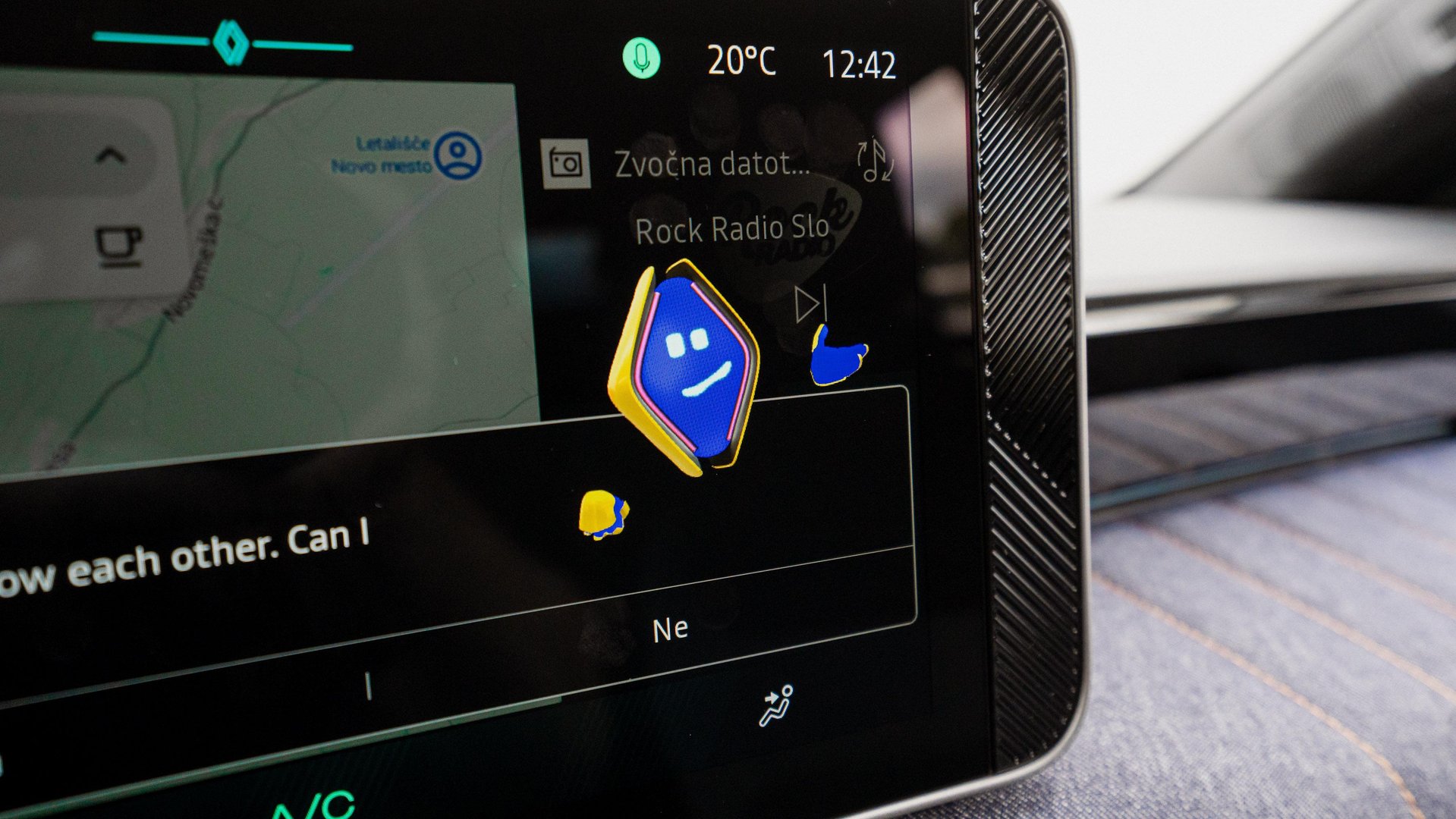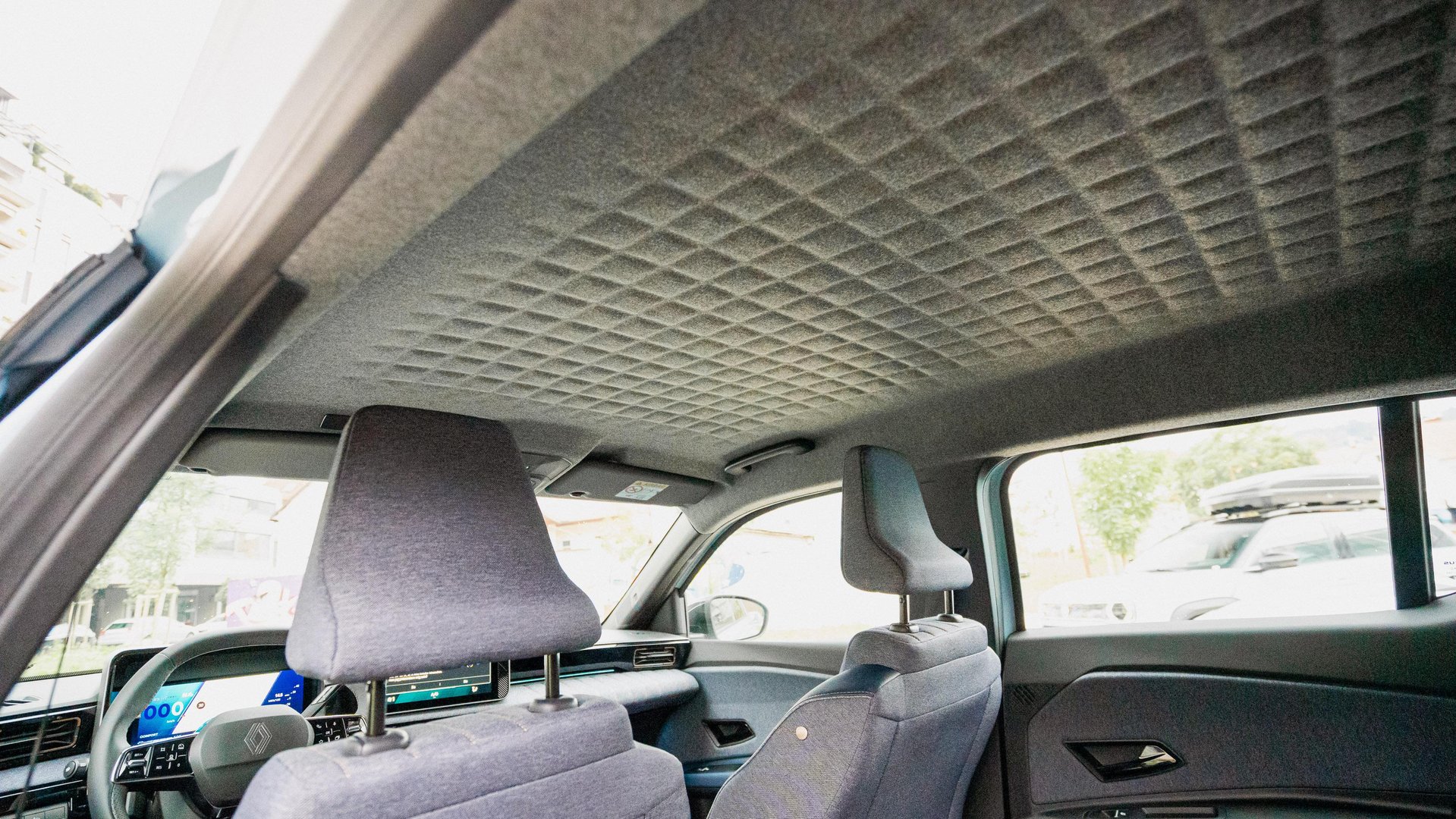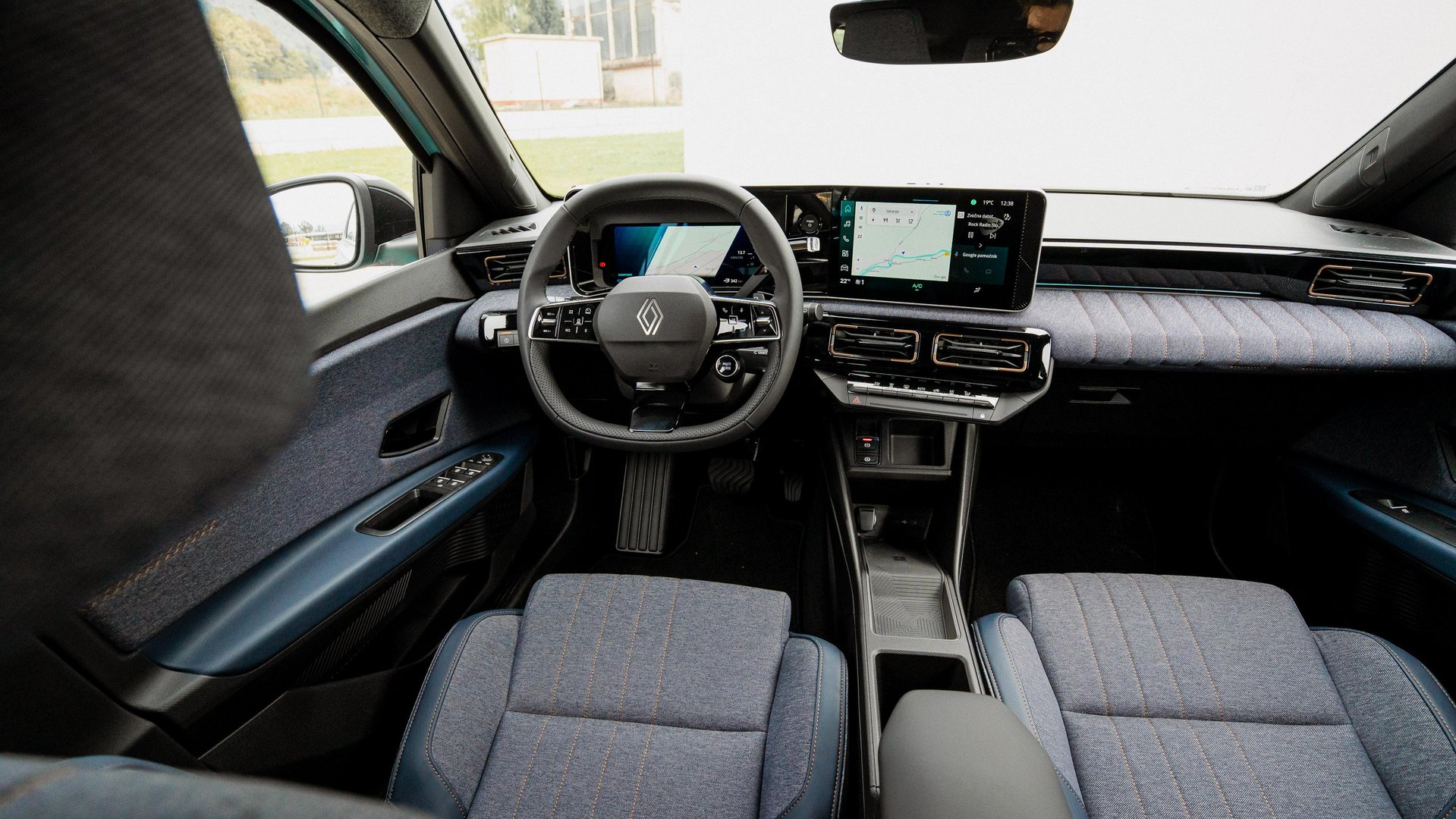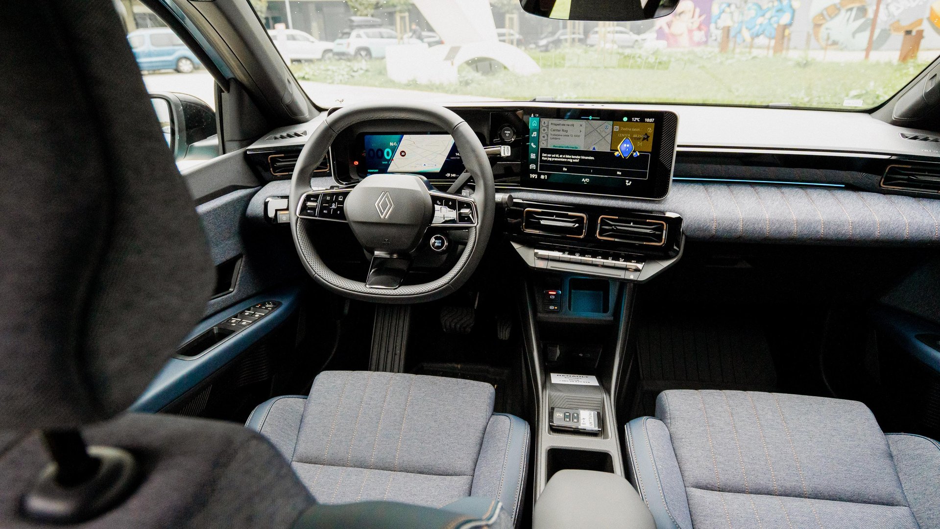 Kabina je urejena in tehnološko posodobljena: digitalni merilniki (do 10,1'') in openR link z 10-palčnim zaslonom ter integriranimi Googlovimi storitvami (Maps, Assistant, Play). Glasovni pomočnik Reno (z ChatGPT) skrbi za enostavnejše upravljanje vozila in polnjenja; pomembnejše je, da sistem dobro deluje z brezžičnima Android Auto in Apple CarPlay. Za zvočno in toplotno udobje skrbijo akustično vetrobransko steklo, dodatna zvočna izolacija baterije in toplotna črpalka.