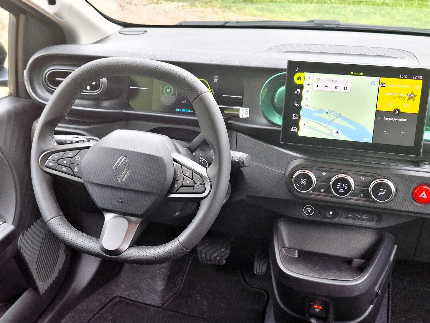 Armaturna plošča ima nekoliko drugačno postavitev kot v sorodnikih Renault 4 in Renault 5. Pred voznikovimi očmi je digitaliziran sklop merilnikov in ostalih pomembnih podatkov, vse ostalo pa je prepuščeno delu z 10-palčnim zaslonom na dotik za multimedijski sistem. Pod njim so velika vrtljiva stikala za klimatsko napravo in izrazito stikalo za varnostne utripalke, ki spominja na originalnega Twinga.