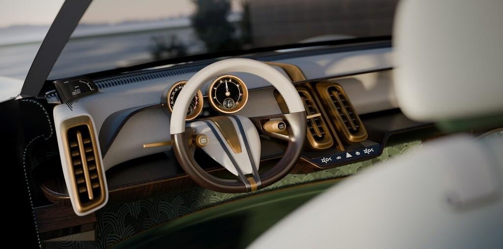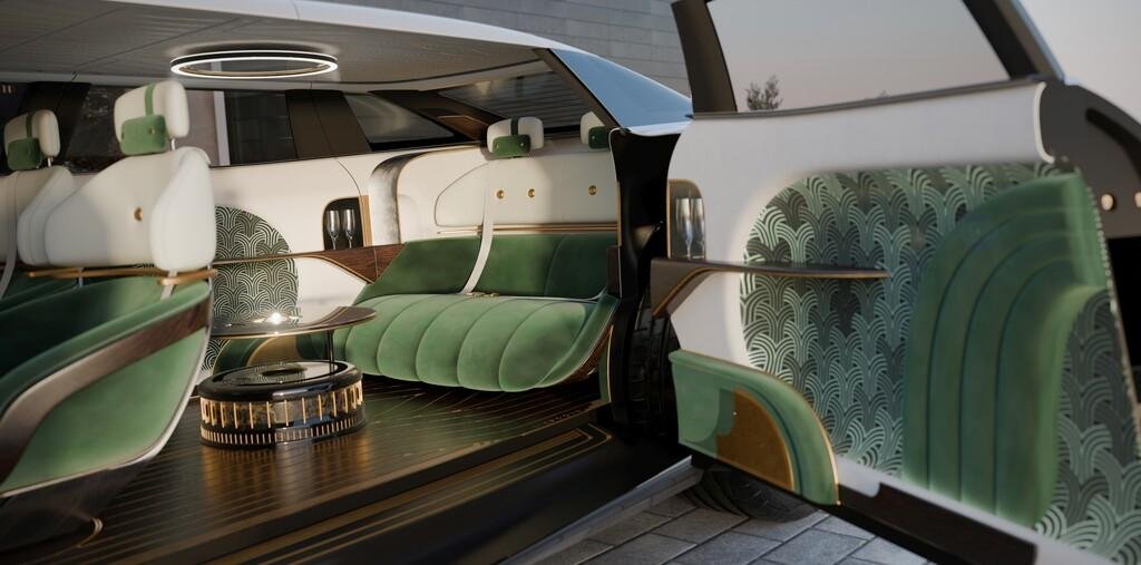 V notranjosti za ekskluzivno ambientalno izkušnjo skrbijo temen les, zelene plišaste tkanine, svetle površine in zlati poudarki. Tako zunanjost kot notranjost vključujeta slogovne elemente iz dvajsetih, tridesetih in sedemdesetih let prejšnjega stoletja. Voznikovo delovno mesto sledi podobnemu oblikovalskemu jeziku, saj združuje klasične instrumente s sodobno funkcionalnostjo in v veliki meri odpravlja stikala, gumbe in velike zaslone na dotik.