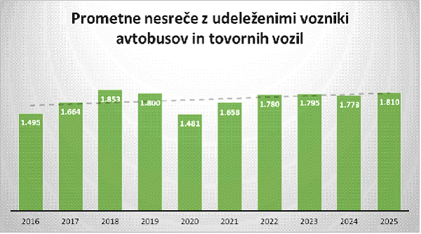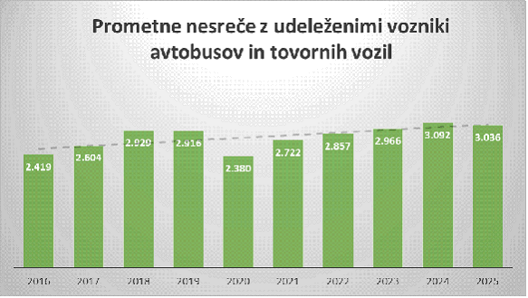 Cestni tovorni promet v Sloveniji se je v zadnjih desetletjih močno povečal, s tem pa tudi obseg prometa in kompleksnost zagotavljanja prometne varnosti.Po zadnjih podatkih so bili vozniki tovornih vozil in avtobusov v letu 2025 udeleženi v 3.036 prometnih nesrečah, povzročili pa so jih 1.810. V teh nesrečah sta umrla dva voznika tovornega vozila, 14 voznikov tovornih vozil in en voznik avtobusa pa so bili huje poškodovani. Leta 2024 so v prometnih nesrečah umrli štirje vozniki tovornih vozil in en voznik avtobusa.