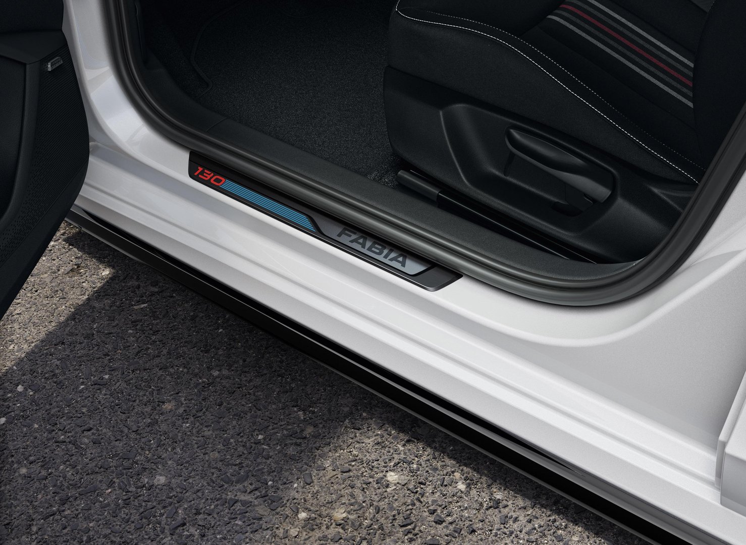 V notranjosti najdemo športna sedeža z integriranimi vzglavniki, srebrne dekorativne elemente in posebne pragove z napisom Fabia 130. Nič razkošja, ampak dovolj značaja, da voznik začuti športni namen avtomobila.