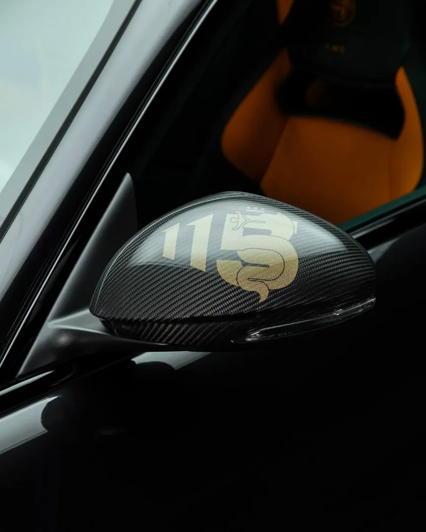 Pri limuzini Giulia Quadrifoglio so ubrali precej izrazit pristop. Karoserija je odeta v temen odtenek z grafiko Alfinega grba na pokrovu motorja, celoten vtis pa dopolnjujejo zlati detajli na platiščih, zavorah in aerodinamičnih dodatkih. Posebne oznake obletnice so razporejene po celotnem vozilu, tudi na karbonskih elementih v notranjosti. Kabina združuje črno in oranžno usnje, pri čemer napis “1 of 5” jasno poudarja redkost.