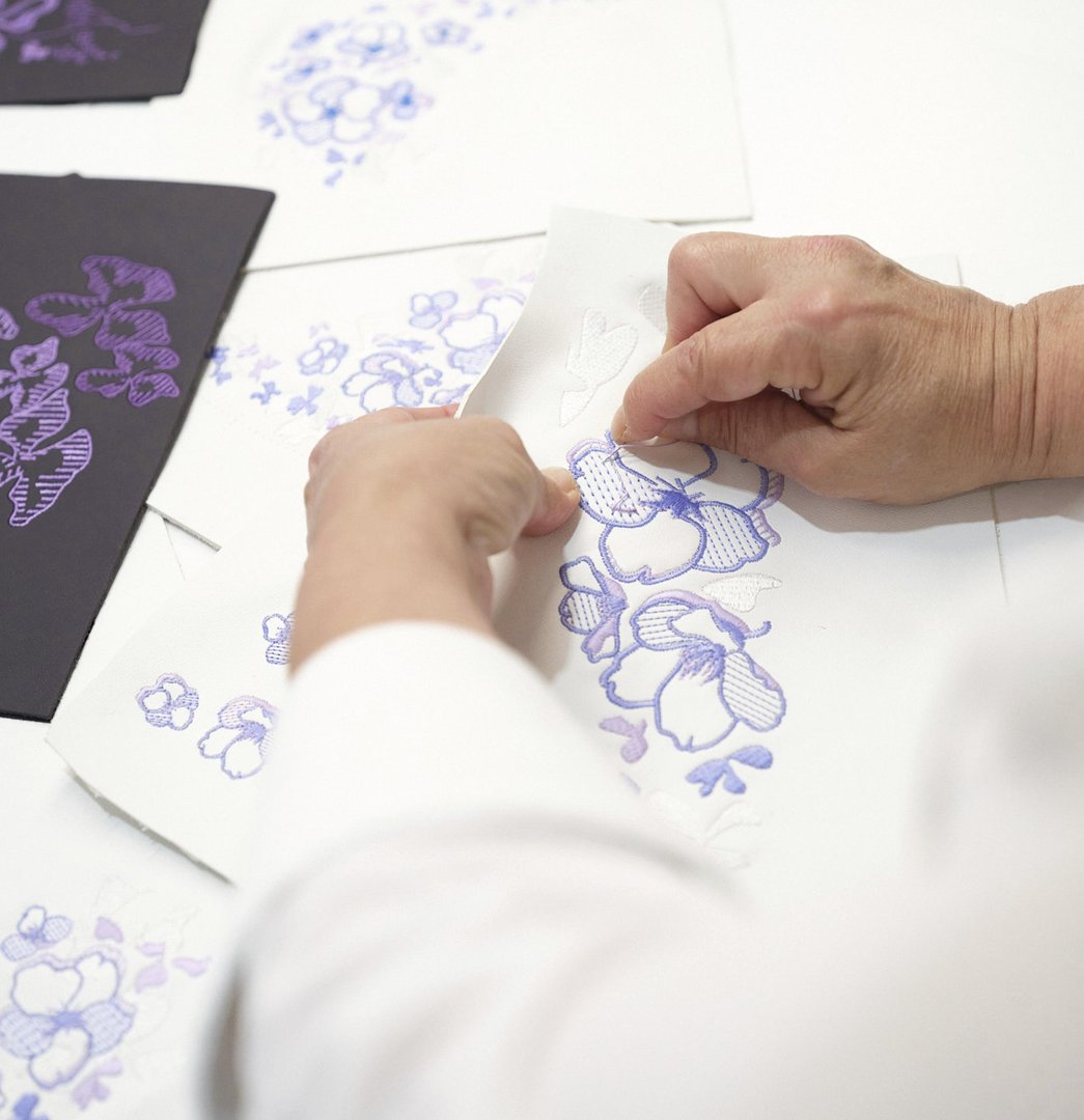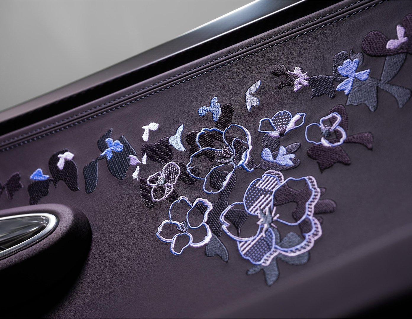 Notranjost ne zaostaja za zunanjostjo. Kombinacija svetlega in temnega usnja, dopolnjena z vijoličnimi poudarki, ustvarja izrazit kontrast. Posebnost pa so natančno izdelane cvetlične vezenine, ki krasijo ključne dele kabine – od sedežev do sredinskega tunela.