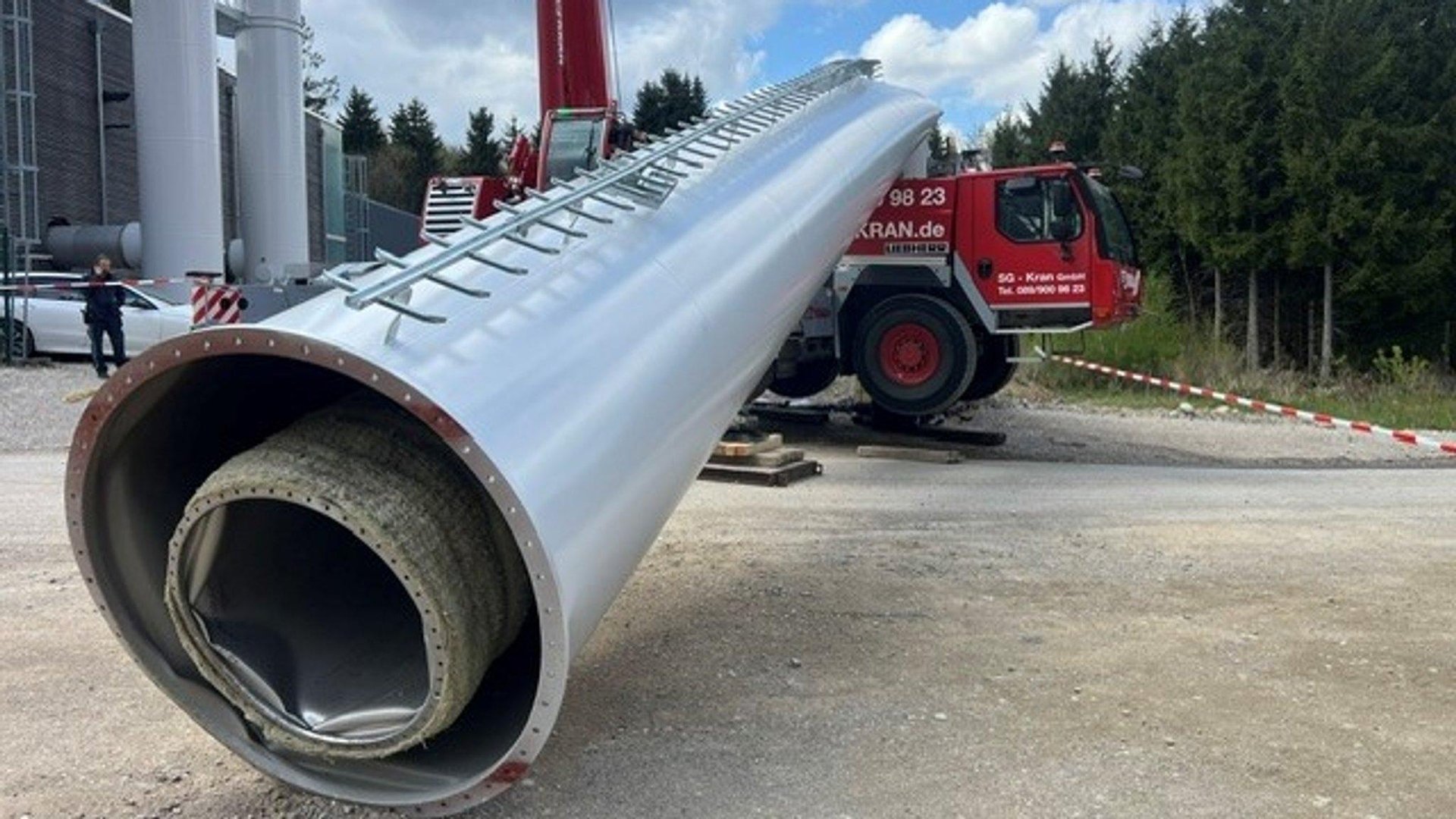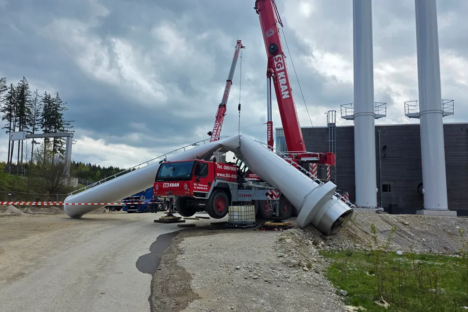 Na območju geotermalnega obrata v nemškem Holzkirchnu se je v torek opoldne zgodila izjemno dramatična nesreča, ki je na srečo minila brez poškodb, a z veliko materialno škodo. Med postavljanjem zadnjega dela dimnika se je približno 20 metrov visoka konstrukcija nenadoma zrušila in padla na žerjav.